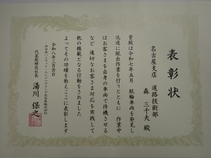 この度弊社社員(森)が、中日本ハイウェイ・エンジニアリング名古屋(株)様より表彰を受けました。